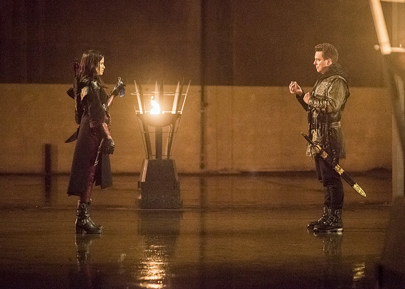 Arrow -- "Sins of the Father" -- Image AR413b_0292b.jpg -- Pictured (L-R): Katrina Law as Nyssa al Ghul and John Barrowman as Malcolm Merlyn -- Photo: Dean Buscher/ The CW -- © 2016 The CW Network, LLC. All Rights Reserved.