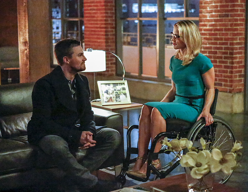 Arrow -- "Sins of the Father" -- Image ARR413a_0059b.jpg -- Pictured (L-R): Stephen Amell as Oliver Queen and Emily Bett Rickards as Felicity Smoak -- Photo: Bettina Strauss/ The CW -- © 2016 The CW Network, LLC. All Rights Reserved.