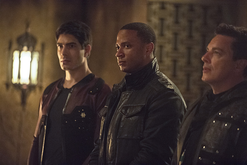 Arrow -- "This is Your Sword" -- Image AR322B_0063b -- Pictured (L-R): Brandon Routh as Ray Palmer, David Ramsey as John Diggle and John Barrowman as Malcolm Merlyn -- Photo: Cate Cameron/The CW -- © 2015 The CW Network, LLC. All Rights Reserved.