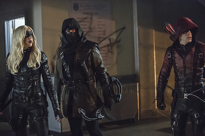 Arrow -- "Uprising" -- Image AR312A_0294b -- Pictured (L-R): Katie Cassidy as Black Canary, John Barrowman as Malcolm Merlyn and Colton Haynes as Arsenal -- Photo: Cate Cameron/The CW -- © 2015 The CW Network, LLC. All Rights Reserved.