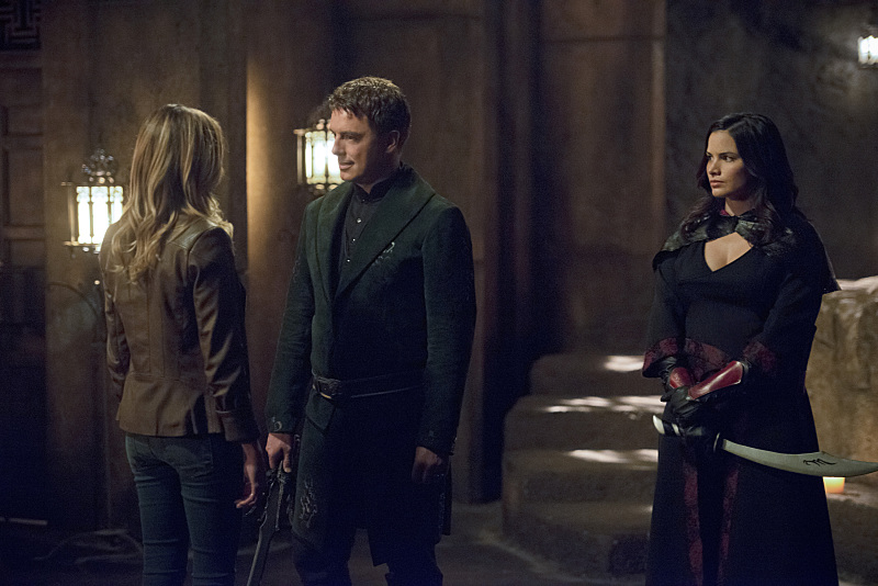 Arrow -- "Restoration" -- Image AR403B_0048b.jpg -- Pictured (L-R): Katie Cassidy as Laurel Lance, John Barrowman as Malcolm Merlyn and Katrina Law as Nyssa al Ghul -- Photo: Diyah Pera /The CW -- © 2015 The CW Network, LLC. All Rights Reserved.