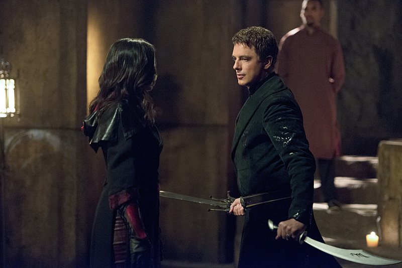Arrow -- "Restoration" -- Image AR403B_0071b.jpg -- Pictured (L-R): Katrina Law as Nyssa al Ghul and John Barrowman as Malcolm Merlyn -- Photo: Diyah Pera /The CW -- © 2015 The CW Network, LLC. All Rights Reserved.