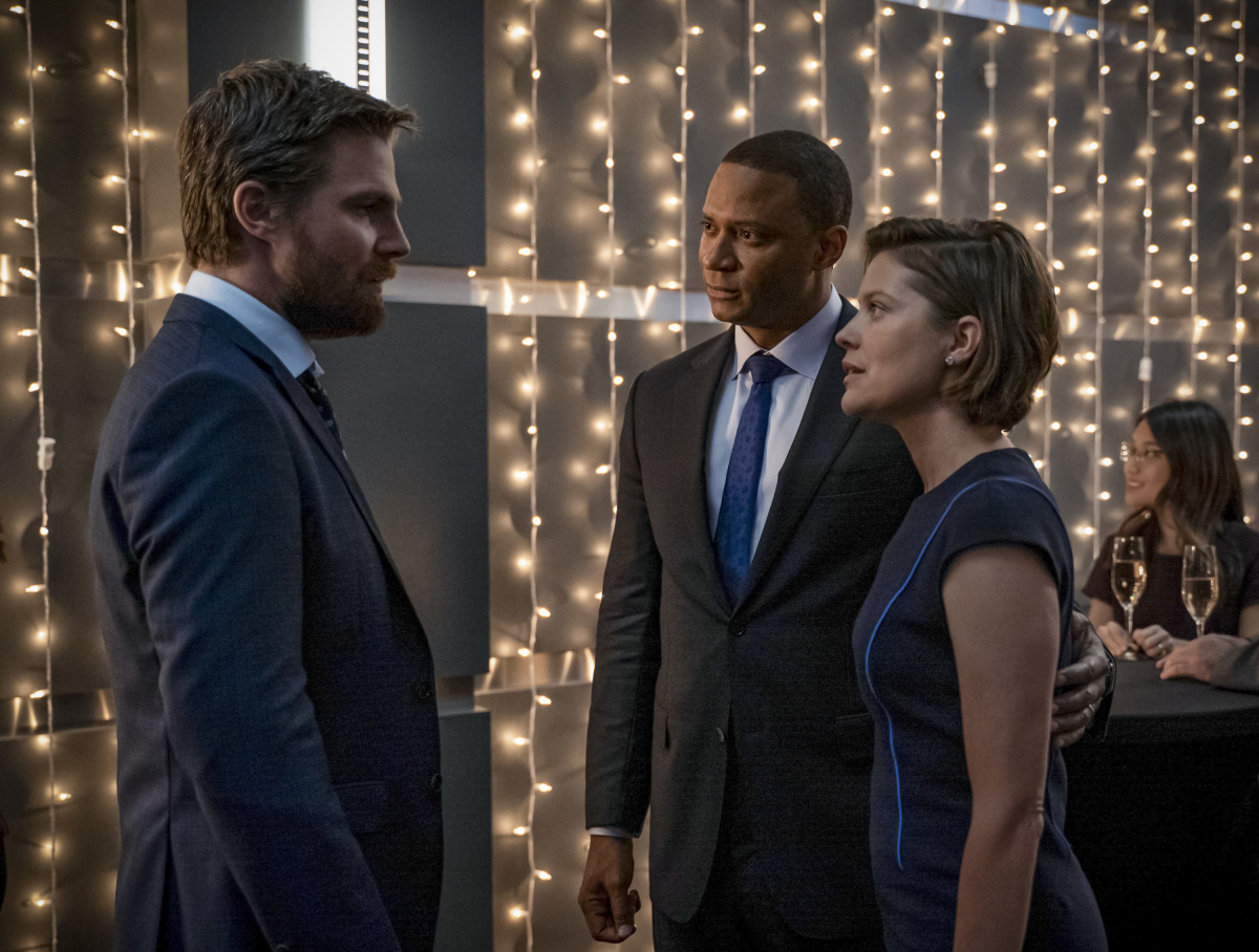 Arrow -- "Reset" -- Image Number: AR806B_0012b.jpg -- Pictured (L-R): Stephen Amell as Oliver Queen/Green Arrow, David Ramsey as John Diggle/Spartan and Audrey Marie Anderson as Lyla Michaels -- Photo: Colin Bentley/The CW -- © 2019 The CW Network, LLC. All Rights Reserved.
