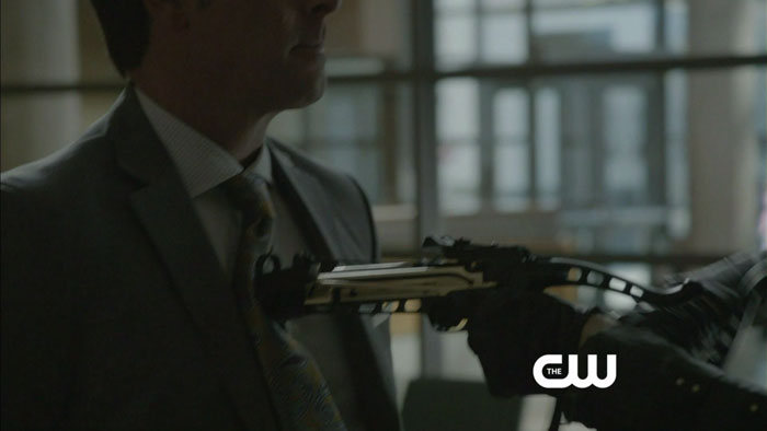 The video clip itself does not appear to be online yet, but thanks to Mr. Video, we have screen captures from a scene from the March 26 episode of Arrow, which is called “Birds of Prey.”