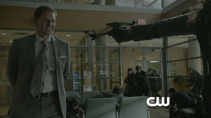 The video clip itself does not appear to be online yet, but thanks to Mr. Video, we have screen captures from a scene from the March 26 episode of Arrow, which is called “Birds of Prey.”