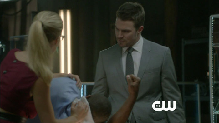 Thanks to Mr. Video, we have screen captures from a preview clip for the episode, featuring Stephen Amell (Oliver), Emily Bett Rickards (Felicity), and David Ramsey (Diggle). We, too, would like to know how Felicity is able to hold Diggle down here, but maybe it’s a lot calmer in the clip itself.