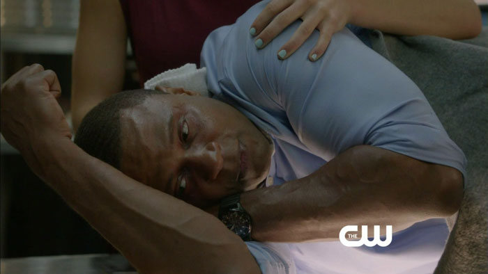 Thanks to Mr. Video, we have screen captures from a preview clip for the episode, featuring Stephen Amell (Oliver), Emily Bett Rickards (Felicity), and David Ramsey (Diggle). We, too, would like to know how Felicity is able to hold Diggle down here, but maybe it’s a lot calmer in the clip itself.