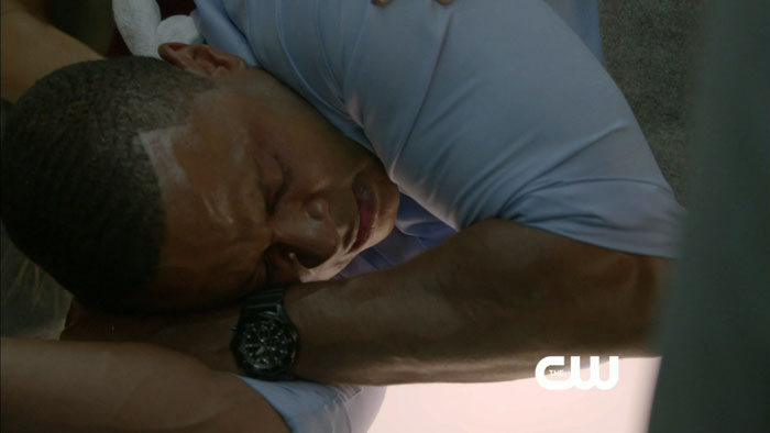 Thanks to Mr. Video, we have screen captures from a preview clip for the episode, featuring Stephen Amell (Oliver), Emily Bett Rickards (Felicity), and David Ramsey (Diggle). We, too, would like to know how Felicity is able to hold Diggle down here, but maybe it’s a lot calmer in the clip itself.