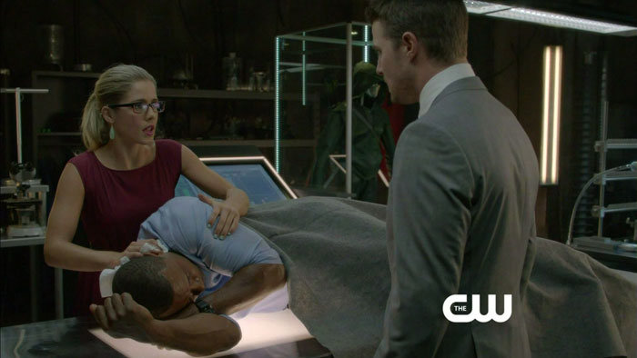 Thanks to Mr. Video, we have screen captures from a preview clip for the episode, featuring Stephen Amell (Oliver), Emily Bett Rickards (Felicity), and David Ramsey (Diggle). We, too, would like to know how Felicity is able to hold Diggle down here, but maybe it’s a lot calmer in the clip itself.