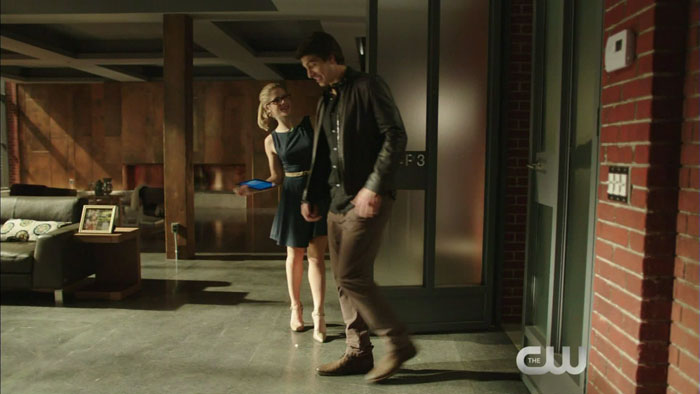 The clip features Emily Bett Rickards as Felicity and Brandon Routh as Ray Palmer, and it looks like she’s trying to get his help in identifying a piece of technology.