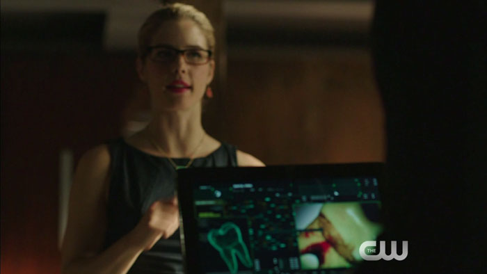 The clip features Emily Bett Rickards as Felicity and Brandon Routh as Ray Palmer, and it looks like she’s trying to get his help in identifying a piece of technology.