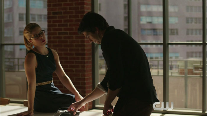 The clip features Emily Bett Rickards as Felicity and Brandon Routh as Ray Palmer, and it looks like she’s trying to get his help in identifying a piece of technology.