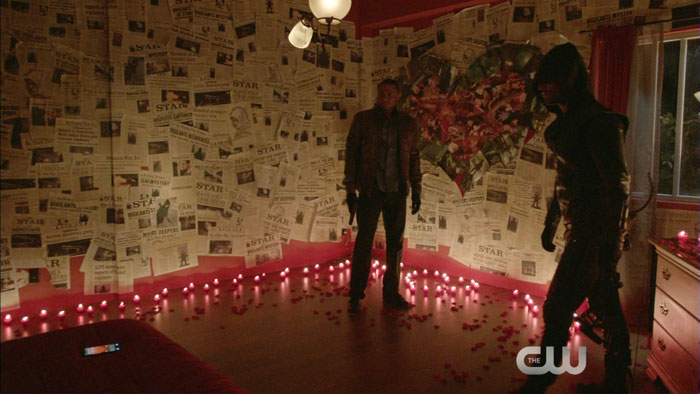 The webclip for Wednesday night’s new episode “Draw Back Your Bow” features Stephen Amell as Oliver/The Arrow, birthday boy David Ramsey as Diggle, and Amy Gumenick as Cupid. Enjoy the caps below, and if the clip goes online, we’ll post it.