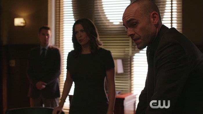 The clip features Katie Cassidy as Laurel, Brandon Routh as Ray, and Vinnie Jones as the villain Danny “Brick” Brickwell; but if you look at all the caps, you’ll also see that Paul Blackthorne (Quentin) and Emily Bett Rickards (Felicity) show up too.