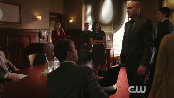 The clip features Katie Cassidy as Laurel, Brandon Routh as Ray, and Vinnie Jones as the villain Danny “Brick” Brickwell; but if you look at all the caps, you’ll also see that Paul Blackthorne (Quentin) and Emily Bett Rickards (Felicity) show up too.