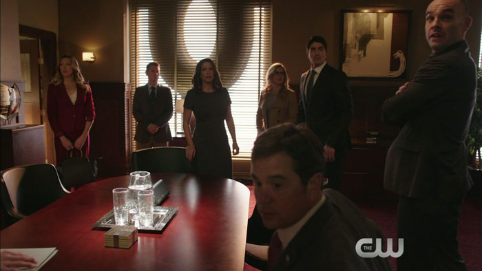 The clip features Katie Cassidy as Laurel, Brandon Routh as Ray, and Vinnie Jones as the villain Danny “Brick” Brickwell; but if you look at all the caps, you’ll also see that Paul Blackthorne (Quentin) and Emily Bett Rickards (Felicity) show up too.