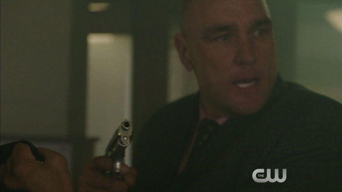 The clip features Katie Cassidy as Laurel, Brandon Routh as Ray, and Vinnie Jones as the villain Danny “Brick” Brickwell; but if you look at all the caps, you’ll also see that Paul Blackthorne (Quentin) and Emily Bett Rickards (Felicity) show up too.