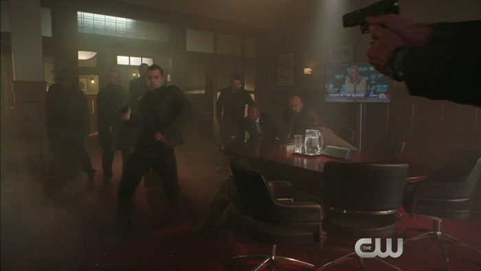 H141A-128-ARW-110-85We’re assuming the actual video clip will surface in a day or two, but thanks to Mr. Video, we have screen captures from a preview clip for Wednesday’s new episode of Arrow, titled “Midnight City.”