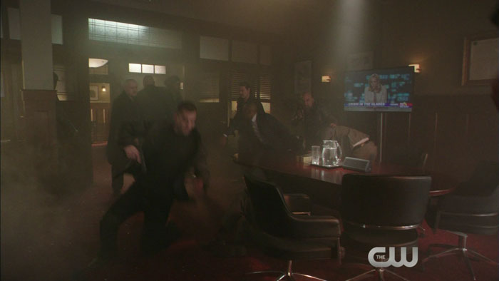 The clip features Katie Cassidy as Laurel, Brandon Routh as Ray, and Vinnie Jones as the villain Danny “Brick” Brickwell; but if you look at all the caps, you’ll also see that Paul Blackthorne (Quentin) and Emily Bett Rickards (Felicity) show up too.