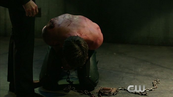 The episode is called “Kapiushon” and the trailer shows off what a sadistic something-or-other that Adrian Chase is. Also, Oliver Queen in chains! Enjoy the screencaps below.
