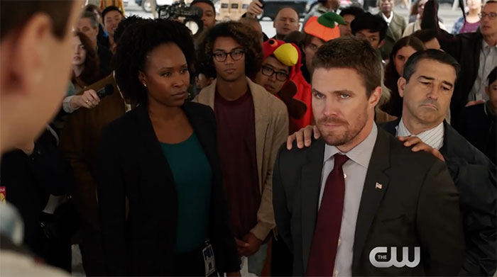 We have some interviews, official photos, spoilers and more related to the episode here at GreenArrowTV, but right now we’re going to share some still frames from the trailer to the episode. Oliver Queen is apparently arrested on Turkey Day, Cayden James (Michael Emerson) is a person of interest, and there’s an awesome shot of the “New” Team Arrow members. Also, Black Siren (Katie Cassidy) is back!