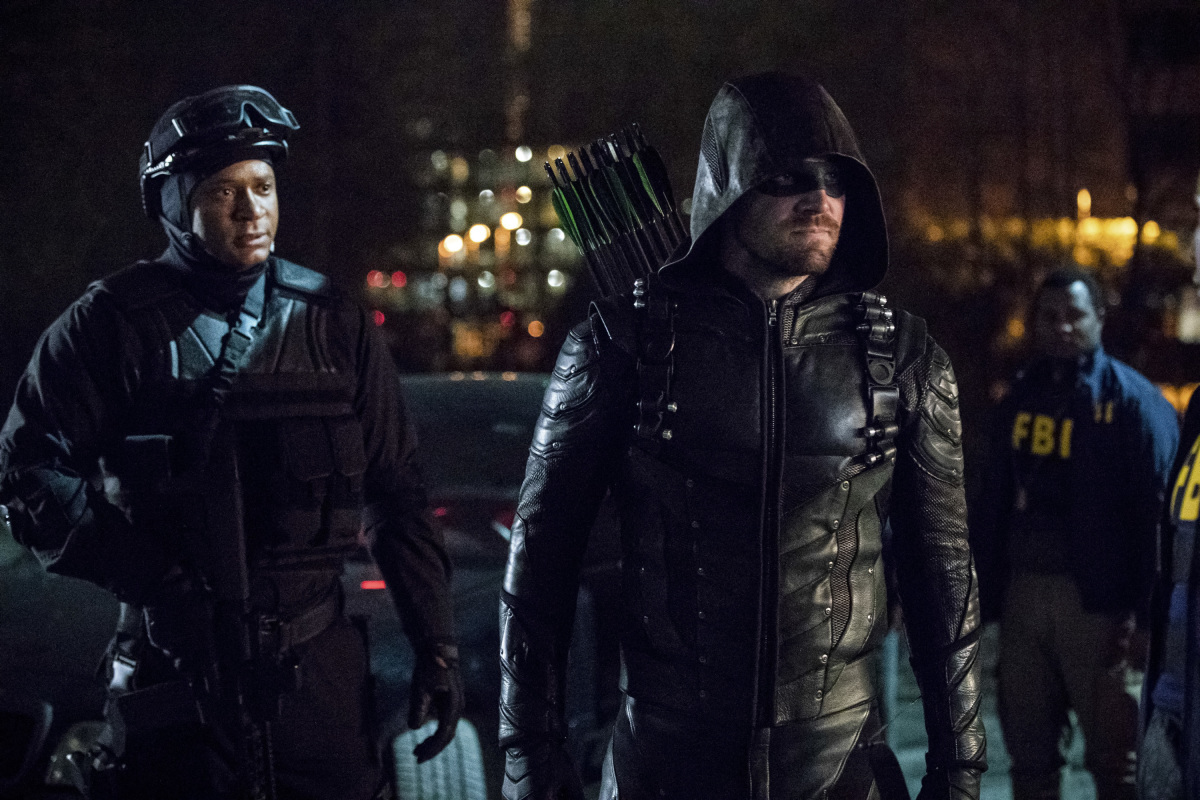 THE EPIC SEASON FINALE OF ARROW — With a new ally on his team, Oliver (Stephen Amell) engages Diaz (guest star Kirk Acevedo) in an epic final battle. James Bamford directed the episode written by Wendy Mericle & Marc Guggenheim (#623). Original airdate 5/17/2018.