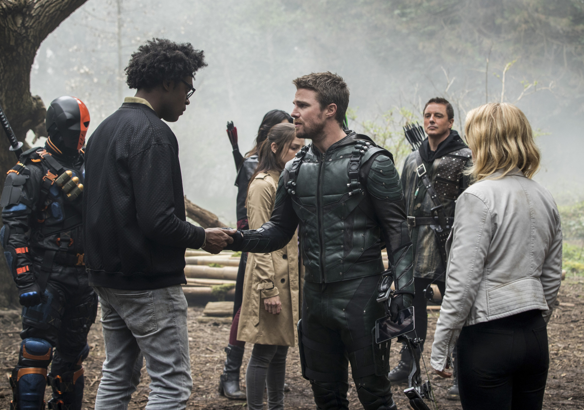 Arrow -- "Lian Yu" -- Image AR523a_0502b.jpg -- Pictured (L-R): Deathstroke, Echo Kellum as Curtis Holt/Mr.Terrific, Anne Hopkins as Samantha, Stephen Amell as Oliver Queen/The Green Arrow, John Barrowman as Malcolm Merlyn, and Emily Bett Rickards as Felicity Smoak -- Photo: Jack Rowand/The CW -- é 2017 The CW Network, LLC. All Rights Reserved.