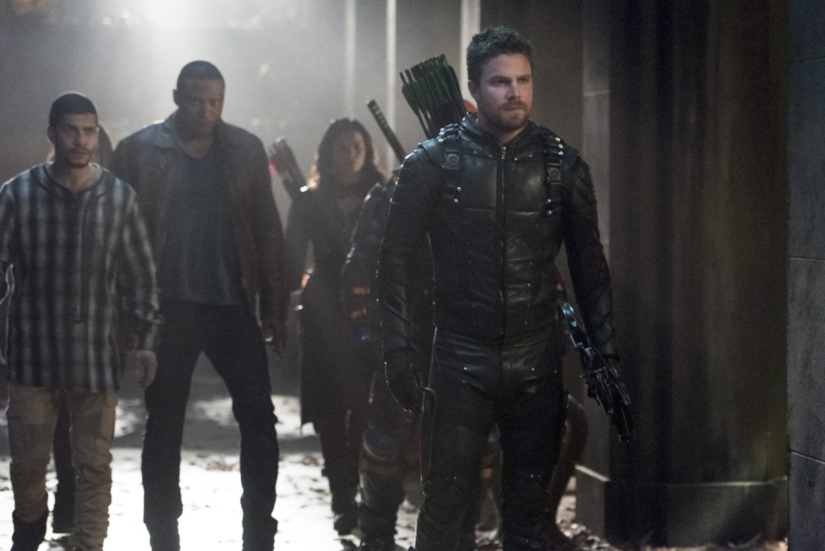 Arrow -- "Lian Yu" -- Image AR523b_0016b.jpg -- Pictured (L-R): Rick Gonzalez as Rene Ramirez/Wild Dog, David Ramsey as John Diggle/Spartan, Katrina Law as Nyssa al Ghul, and Stephen Amell as Oliver Queen/The Green Arrow -- Photo: Dean Buscher/The CW -- é 2017 The CW Network, LLC. All Rights Reserved.