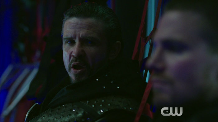 To promote it, The CW will be releasing some preview clips for sure… and thanks to Mr. Video, we have screen captures from one of them. In this clip, which features Stephen Amell as Oliver Queen/Al Sah-Him with Matt Nable as Ra’s al Ghul, we finally see what that new set is that Marc Guggenheim tweeted about weeks ago – it’s the inside of an airplane.