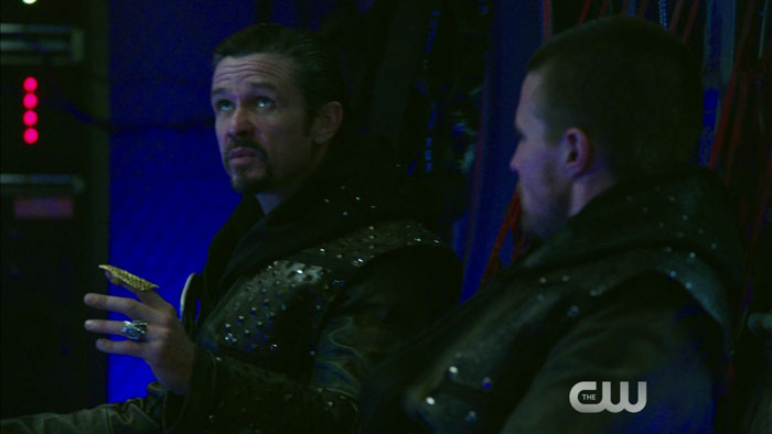 To promote it, The CW will be releasing some preview clips for sure… and thanks to Mr. Video, we have screen captures from one of them. In this clip, which features Stephen Amell as Oliver Queen/Al Sah-Him with Matt Nable as Ra’s al Ghul, we finally see what that new set is that Marc Guggenheim tweeted about weeks ago – it’s the inside of an airplane.
