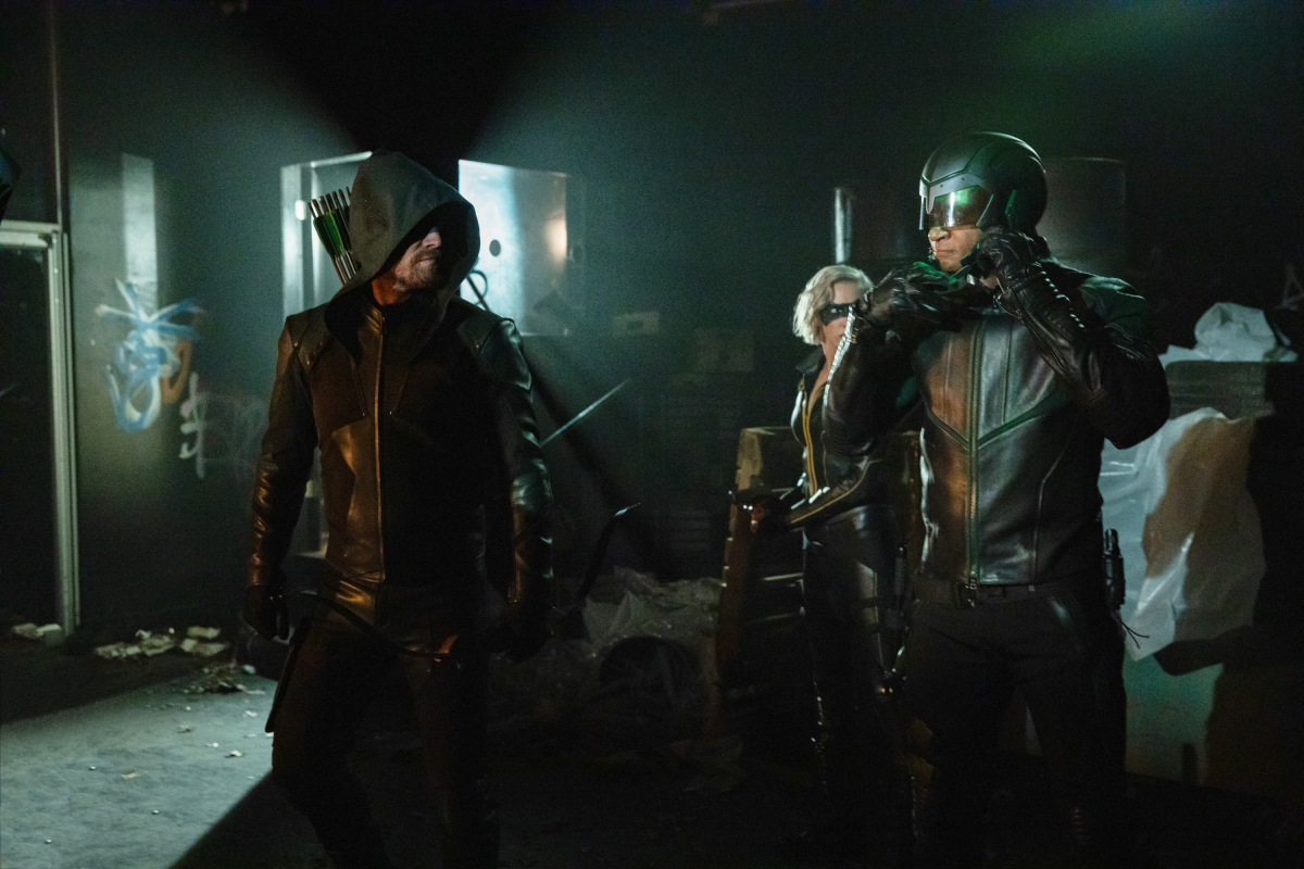Arrow -- "Starling City" -- Image Number: AR801b_0067b.jpg -- Pictured (L-R): Stephen Amell as Oliver Queen/Green Arrow, Katie Cassidy as Laurel Lance/Black Siren and David Ramsey as John Diggle/Spartan -- Photo: Jack Rowand/The CW -- © 2019 The CW Network, LLC. All Rights Reserved.