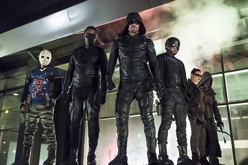 Arrow -- "So It Begins" -- Image AR506b_0067b.jpg -- Pictured (L-R): Rick Gonzalez as Rene Ramirez/Wild Dog, Echo Kellum as Curtis Holt/Mr.Terrific, Stephen Amell as Oliver Queen/The Green Arrow, David Ramsey as John Diggle/Spartan, Madison McLaughlin as Evelyn Sharp/Artemis, and Joe Dinicol as Rory Regan/Ragman -- Photo: Katie Yu/The CW -- é 2016 The CW Network, LLC. All Rights Reserved.