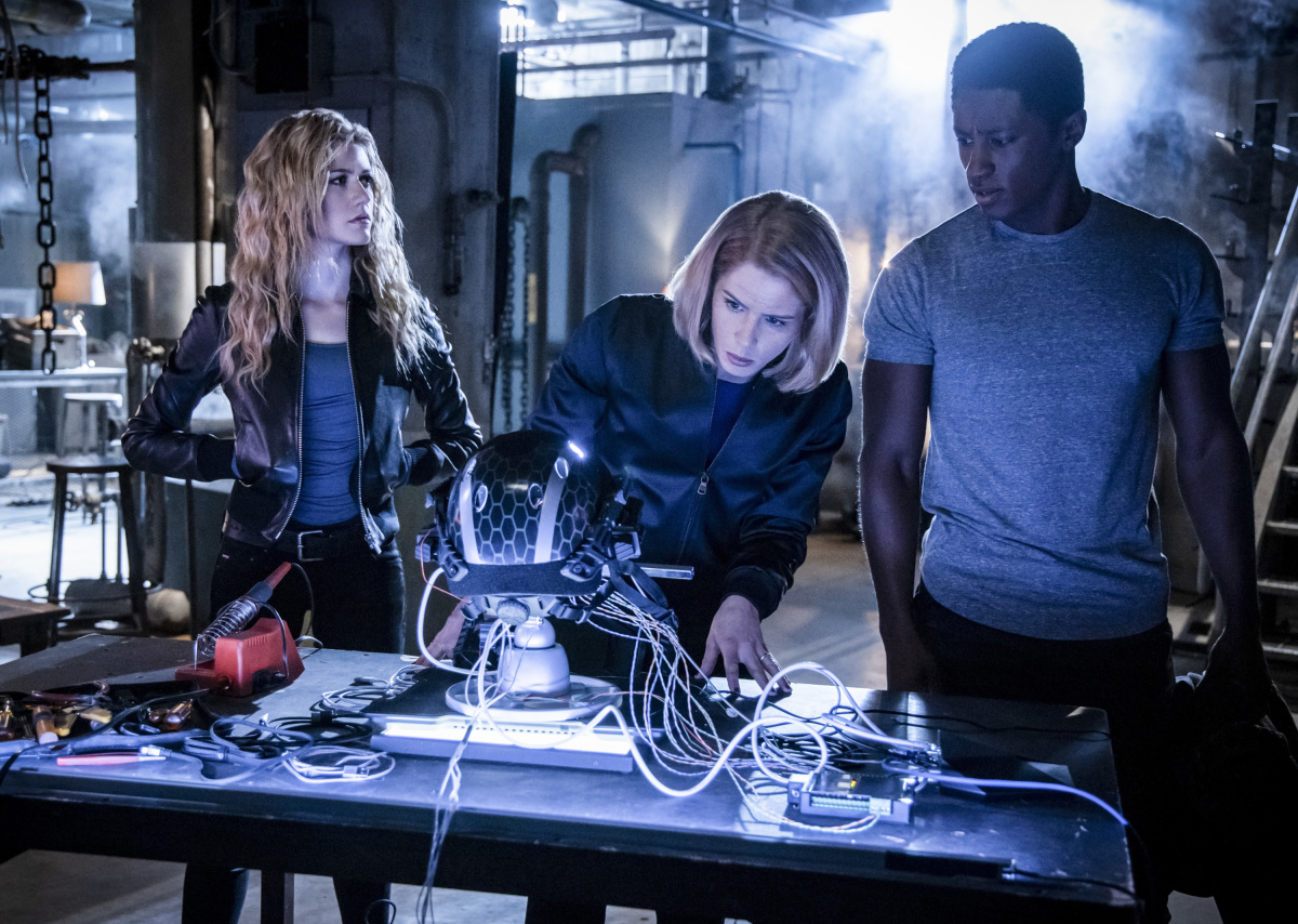 Arrow -- "Spartan" -- Image Number: AR719b_0037b -- Pictured (L-R): Katherine McNamara as Mia/Blackstar, Emily Bett Rickards as Felicity Smoak and Joseph David-Jones as Connor Hawke -- Photo: Jack Rowand/The CW -- © 2019 The CW Network, LLC. All Rights Reserved.