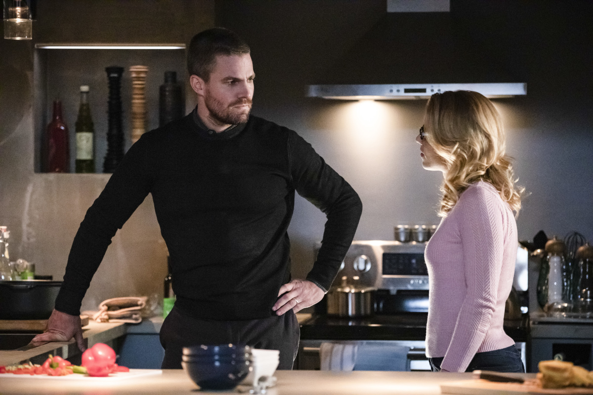 Arrow -- "Star City Slayer" -- Image Number: AR713a_0592b -- Pictured (L-R): Stephen Amell as Oliver Queen/Green Arrow and Emily Bett Rickards as Felicity Smoak -- Photo: Jack Rowand/The CW -- © 2019 The CW Network, LLC. All Rights Reserved.