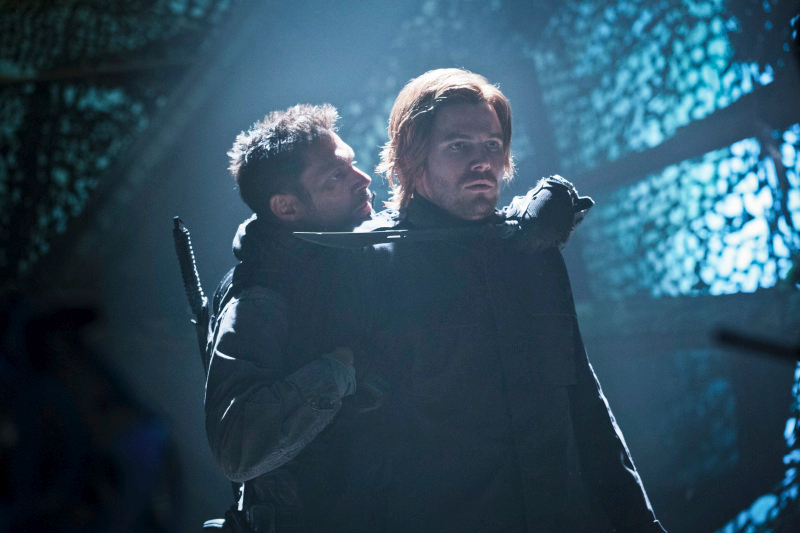 Arrow -- "Betrayal" -- Image AR113b_0094b -- Pictured (L-R): Manu Bennett as Slade Wilson and Stephen Amell as Oliver Queen -- Photo: Jack Rowand/The CW -- © 2013 The CW Network. All Rights Reserved
