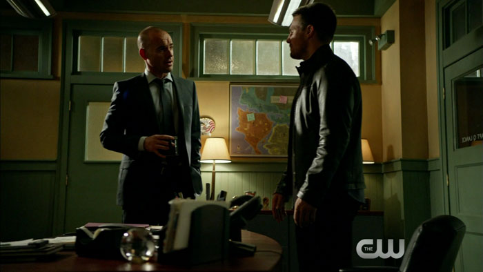 The clip doesn’t appear to be online yet, but as soon as it is, we will post it. The webclip features Oliver (Stephen Amell) paying Captain Lance (Paul Blackthorne) a visit at work. Notice the photos on his desk!
