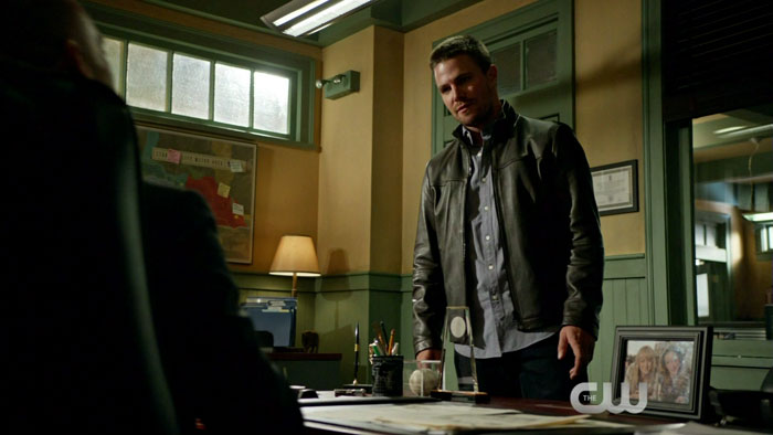 The clip doesn’t appear to be online yet, but as soon as it is, we will post it. The webclip features Oliver (Stephen Amell) paying Captain Lance (Paul Blackthorne) a visit at work. Notice the photos on his desk!