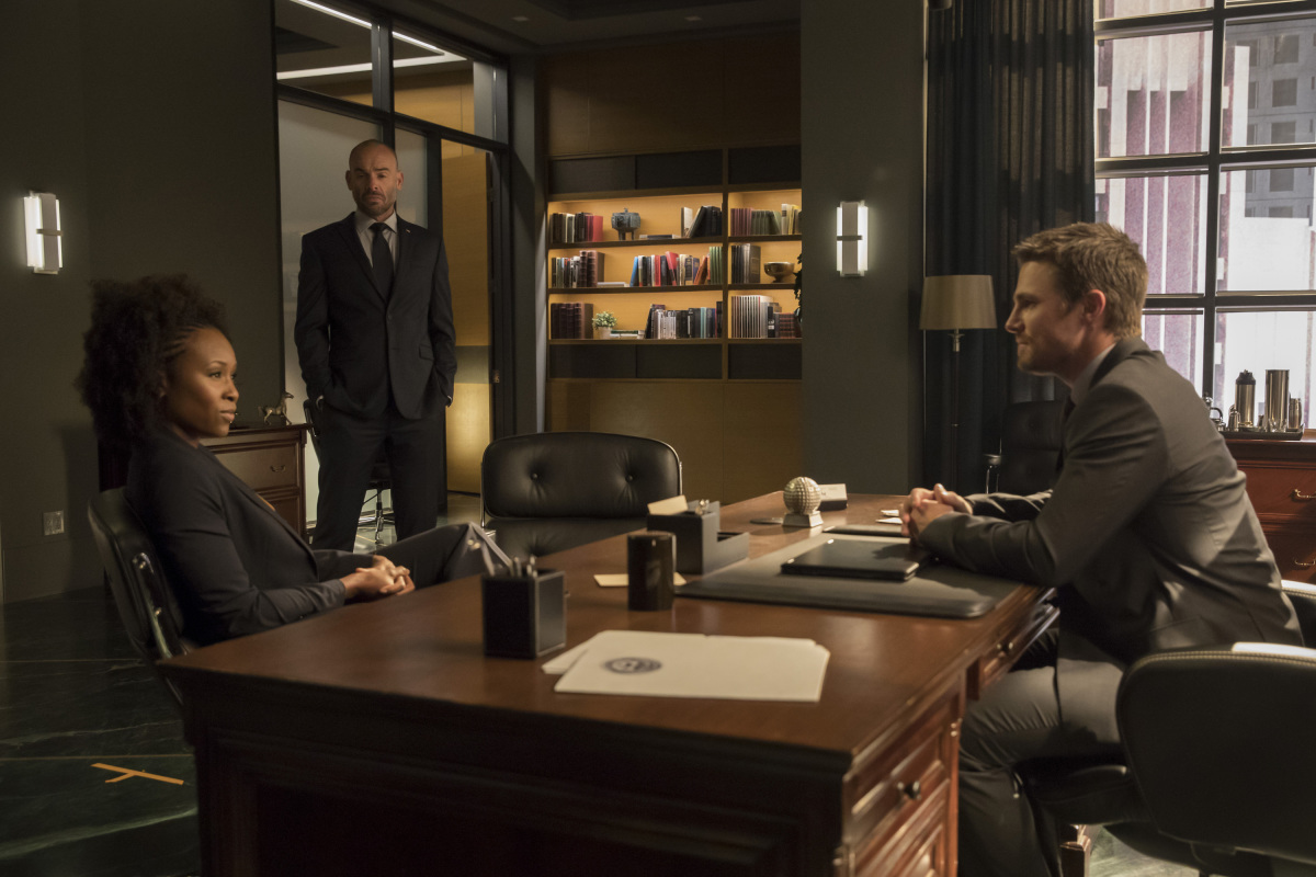 Arrow -- "Next of Kin" -- Image AR603a_0184b.jpg -- Pictured (L-R): Sydelle Noel as Samanda Watson, Paul Blackthorne as Quentin Lance and Stephen Amell as Oliver Queen/The Green Arrow -- Photo: Jack Rowand/The CW -- © 2017 The CW Network, LLC. All Rights Reserved.