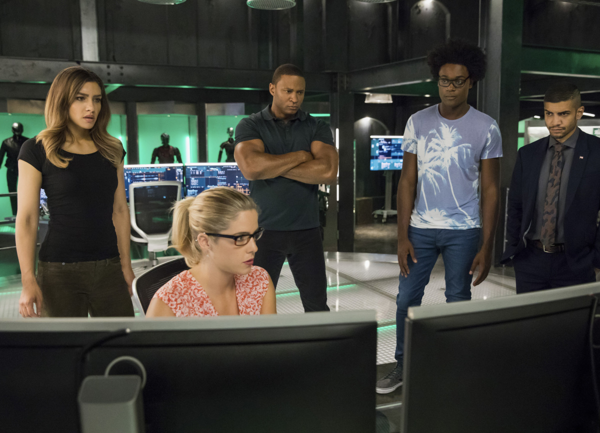 Arrow -- "Next of Kin" -- Image AR603b_0382b.jpg -- Pictured (L-R): Juliana Harkavy as Dinah Drake/Black Canary, Emily Bett Rickards as Felicity Smoak, David Ramsey as John Diggle/Spartan, Echo Kellum as Curtis Holt/Mr.Terrific, and Rick Gonzalez as Rene Ramirez/Wild -- Photo: Jack Rowand/The CW -- é 2017 The CW Network, LLC. All Rights Reserved.