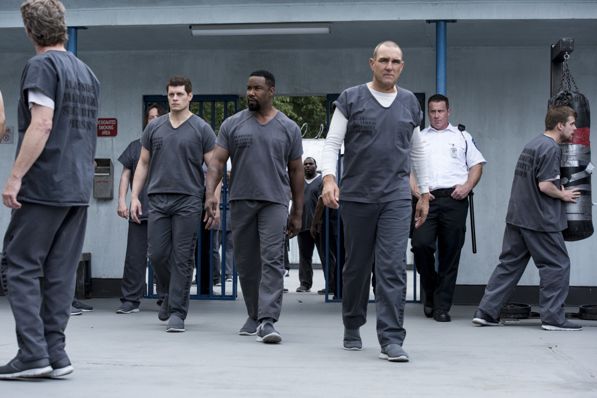 Arrow -- "The Longbow Hunters" -- Image Number: AR702a_0243b -- Pictured (L-R): Cody Runnels as Derek Sampson, Michael Jai White as Ben Turner/Bronze Tiger, and Vinnie Jones as Danny "Brick" Brickwell -- Photo: Dean Buscher/The CW -- é 2018 The CW Network, LLC. All Rights Reserved.