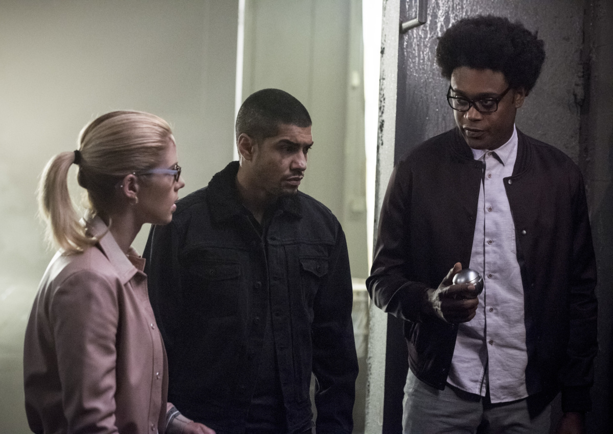 Arrow -- "The Longbow Hunters" -- Image Number: AR702B_0010b -- Pictured (L-R): Emily Bett Rickards as Felicity Smoak, Rick Gonzalez as Rene Ramirez/Wild Dog and Echo Kellum as Curtis Holt -- Photo: Dean Buscher/The CW -- é 2018 The CW Network, LLC. All Rights Reserved.