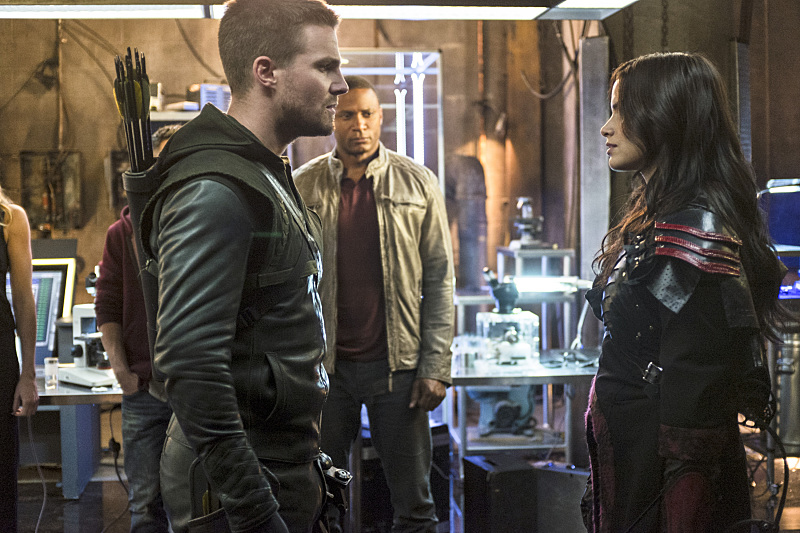 Arrow -- "The Magician" -- Image AR304a_0450b -- Pictured (L-R): Stephen Amell as Oliver Queen, David Ramsey as John Diggle, and Katrina Law as Nyssa al Ghul -- Photo: Ed Araquel/The CW -- © 2014 The CW Network, LLC. All Rights Reserved.