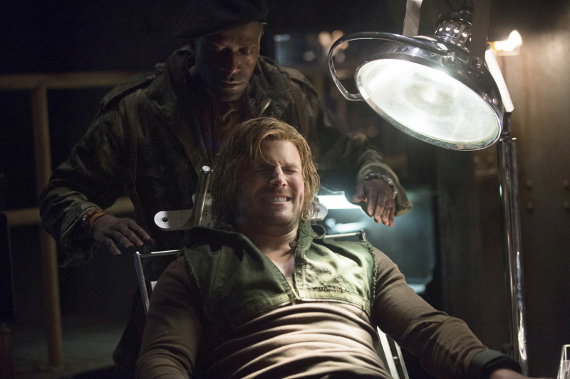 Arrow -- "The Promise" -- Image AR215a_0757b -- Pictured (L-R): Ronald Selmour as The Butcher and Stephen Amell as Oliver Queen -- Photo: Cate Cameron/The CW -- © 2014 The CW Network, LLC. All Rights Reserved.
