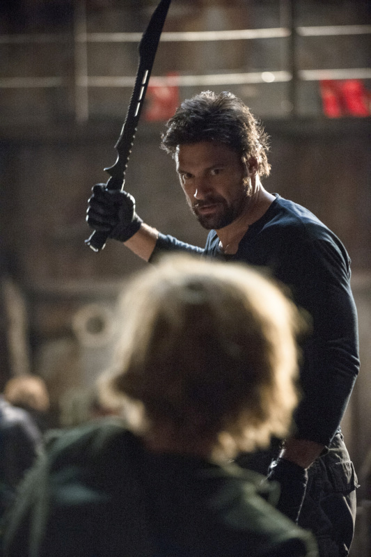 Arrow -- "The Promise" -- Image AR215b_0404b -- Pictured (Top-bottom): Manu Bennett as Slade Wilson and Stephen Amell as Oliver Queen -- Photo: Cate Cameron/The CW -- © 2014 The CW Network, LLC. All Rights Reserved.