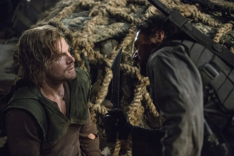 Arrow -- "The Promise" -- Image AR215b_0470b -- Pictured (L-R): Stephen Amell as Oliver Queen and Manu Bennett as Slade Wilson -- Photo: Cate Cameron/The CW -- © 2014 The CW Network, LLC. All Rights Reserved.