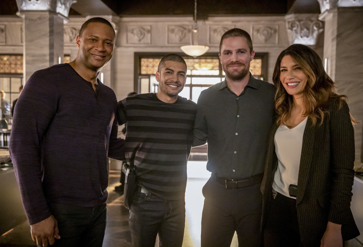 Arrow -- "Training Day" -- Image Number: AR715a_BTS_0622b -- Pictured (L-R): Behind the scenes with David Ramsey, Rick Gonzalez, Stephen Amell and Juliana Harkavy -- Photo: Jack Rowand/The CW -- © 2019 The CW Network, LLC. All Rights Reserved.