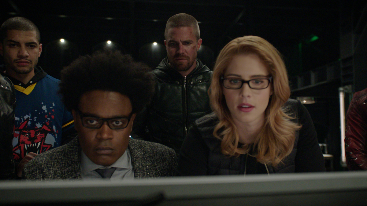 Arrow -- "You Have Saved This City" -- Image Number: AR722_Still_004_050719.jpg -- Pictured (L-R): Rick Gonzalez as Rene Ramirez/Wild Dog, Echo Kellum as Curtis Holt, Stephen Amell as Oliver Queen/Green Arrow and Emily Bett Rickards as Felicity Smoak -- Photo: The CW -- é 2019 The CW Network, LLC. All Rights Reserved.