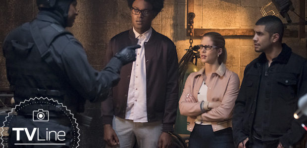The new photo is actually from the second episode of Arrow Season 7, “The Longbow Hunters,” and features John Diggle (David Ramsey) addressing the (former?) members of Team Arrow. In the picture are David Ramsey as John Diggle/Spartan, Echo Kellum as Curtis Holt/Mr. Terrific, Emily Bett Rickards as Felicity Smoak, and Rick Gonzalez as Rene Ramirez/Wild Dog.