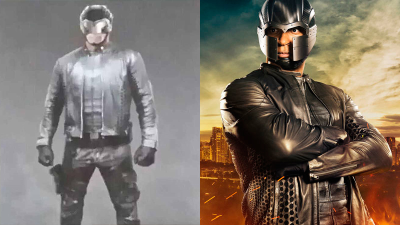 UPDATE: Here’s a comparison of Diggle’s new suit to the concept art that was revealed at this year’s Comic-Con. It would appear that they had to rethink the visor portion, which is why the face guards were extended. Or perhaps, the visor is still there and the face guards might close to seal off Dig’s face completely. We await the season premiere to find out.