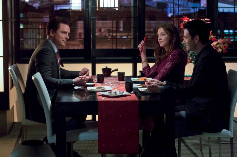 Arrow -- "Trust But Verify" -- Image AR111b_0110b – Pictured (L-R): John Barrowman as Well Dressed Man, Katie Cassidy as Laurel, and Colin Donnell as Tommy -- Photo: Jack Rowand/The CW -- ©2013 The CW Network. All Rights Reserved